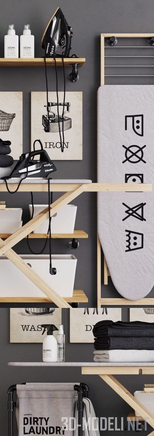 Место, где хозяйки гладят бельё, тоже может выглядеть стильно и современно. Представленный набор аксессуаров, декора и техники наглядно демонстрирует вышесказанное. В наборе: гладильные доски с деревянными каркасами оснований, система полок и корзина для белья, современные утюги, бытовая химия в белых флаконах, декоративные панно с тематическими стилизованными изображениями, белые лотки на полках, цветочный горшок с пучком зеленой травы. Все элементы гармонично подобраны и прекрасно сочетаются друг с другом, создавая уютную зону для глажки белья в современном интерьере.