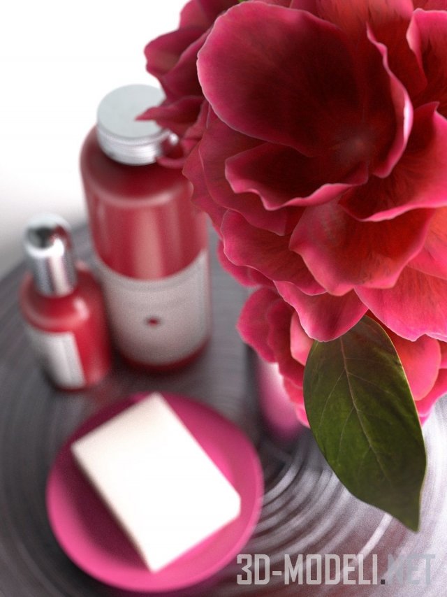 Яркий аксессуар для декора интерьера ванной комнаты – небольшой круглый поднос, с мылом в мыльнице, косметическими средствами и букетом красных цветов. Трехмерная модель высокого качества. Все текстуры в архиве.