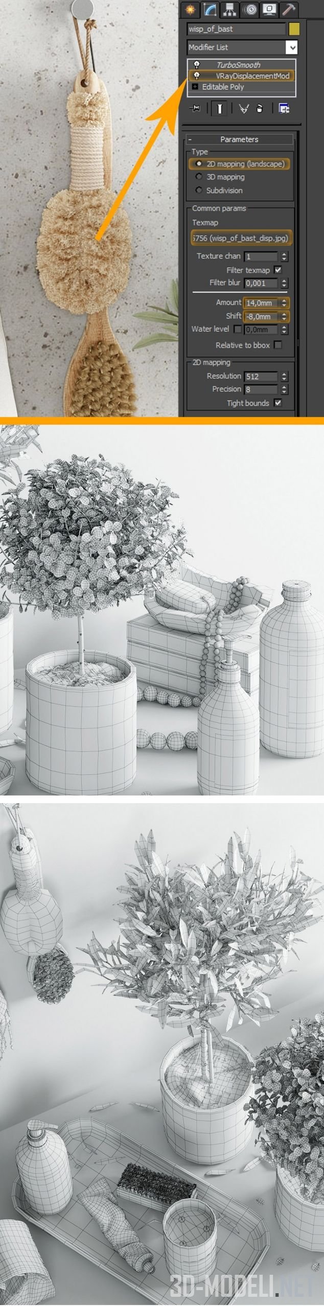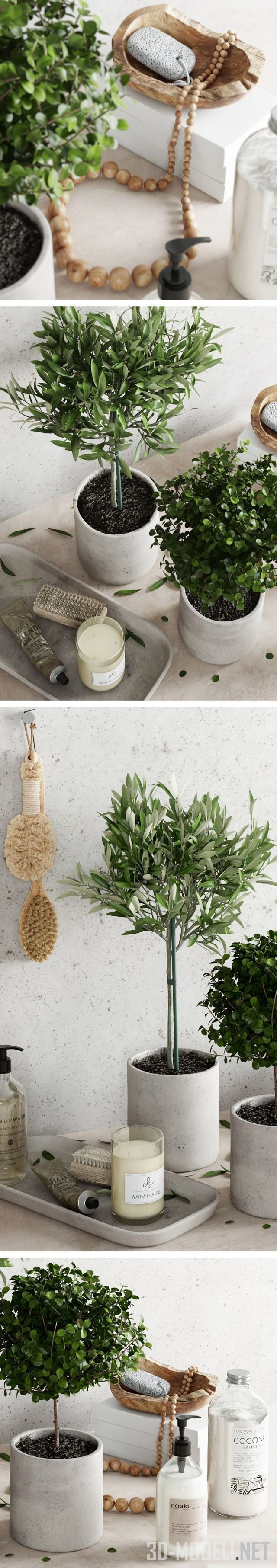 Идеальный набор аксессуаров для ванной комнаты, с целью придать интерьеру экологичность и натуральность. В наборе косметические средства, два зеленых растения в горшках, щетки для растирания, полотенце, свеча для романтики и пр.