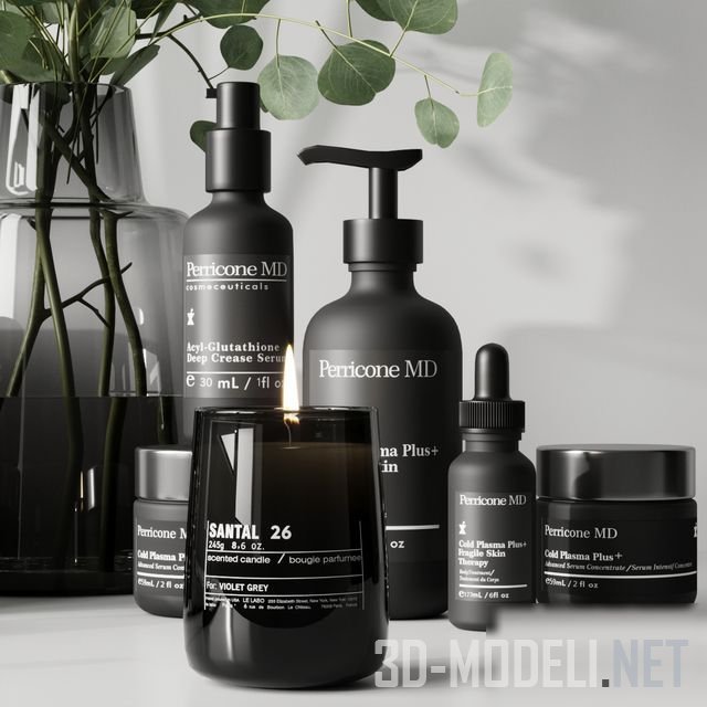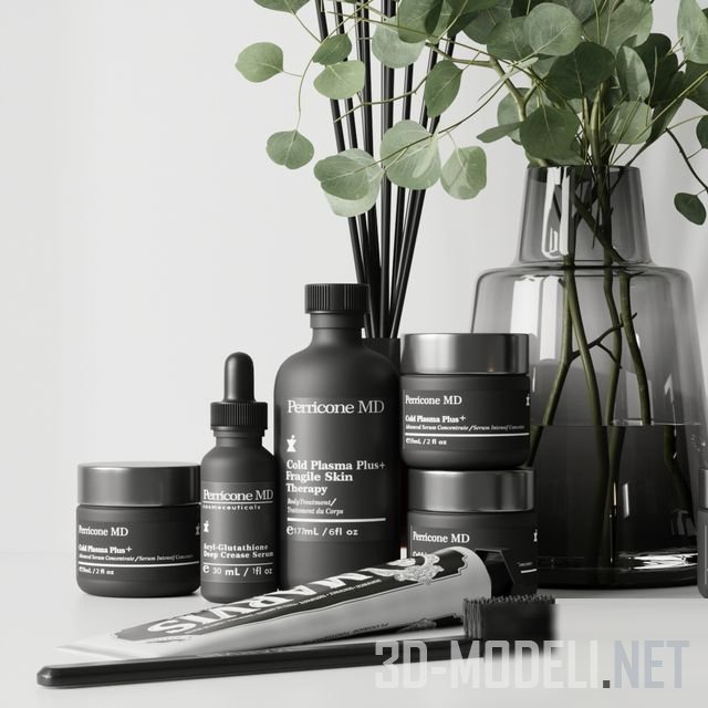 Набор для декорирования интерьера ванной комнаты. Содержит флаконы с косметическими средствами от брендов Marvis, Sandal, Perricone. Зеленые ветки эвкалипта хорошо контрастируют с косметикой.