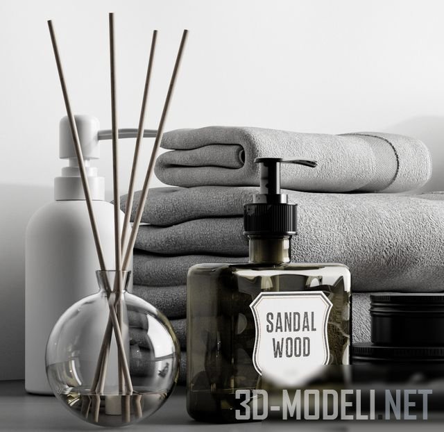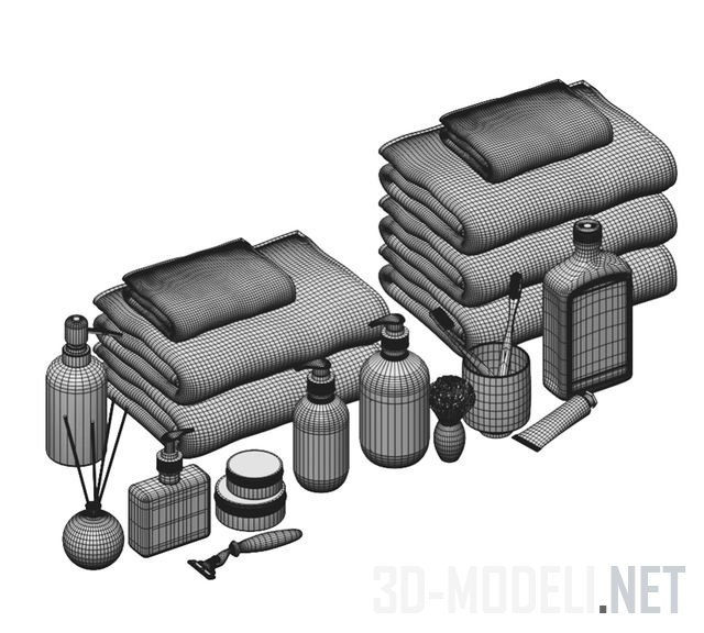 Набор предметов для интерьера современной ванной комнаты. В него входят: стопки больших махровых полотенец светлого цвета, дозаторы с различными жидкостями, бритвенный станок и другие предметы, которые пригодятся в санузле.