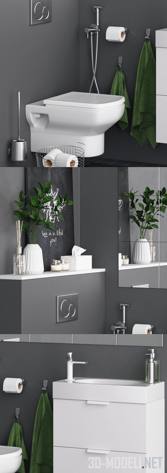 Набор современных туалетных принадлежностей от Godmorgon с подвесным унитазом (Roca Dama Senso). Также в наборе: кнопка (Geberit Sigma), квадратные зеркала IKEA Lots (30 x 30 см), тумба с мойкой (IKEA Godmorgon), аксессуары для ванных комнат (вазы, салфетницы, зеленые полотенца (IKEA Brogrund, H&M Home, Zara Home).