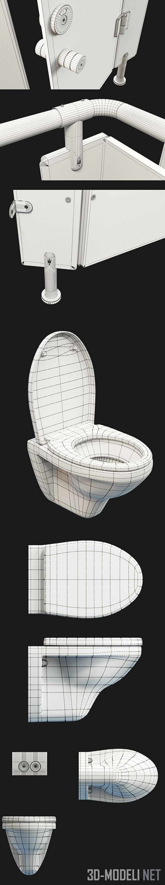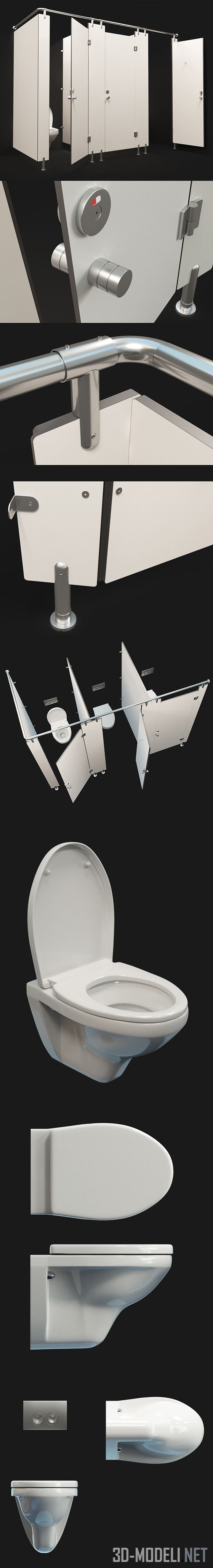 Система кабинок для общественного или офисного туалета на несколько человек – санкабины VISA (220 х 91 х 123 см), а также унитаз Jacob Delafon Patio E4187 (размер 36 х 36 х 53,5 см) с крышкой и сиденьем на микролифте. Кнопка слива Geberit delta 21 из установки Geberit 458.124.21.1.