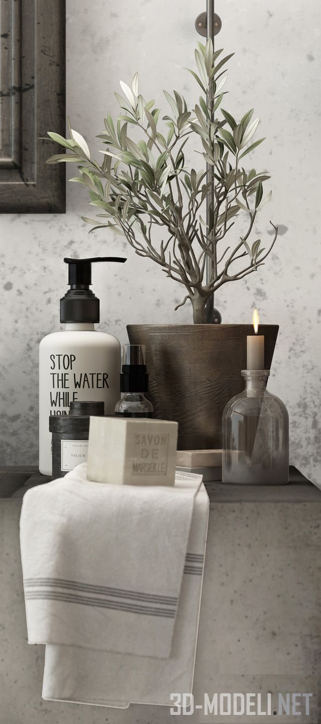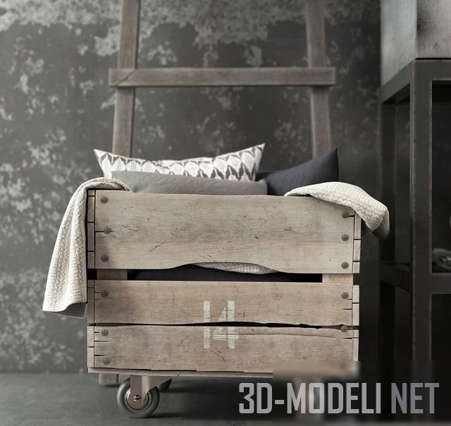 Предметы для интерьера ванной комнаты в нарочито грубом деревенском стиле. Железная консоль коричневого цвета в основе набора. На консоли большая прямоугольная раковина из бетона серого цвета. На ней стоит цветок и различные аксессуары. Над раковиной висит зеркало в состаренной раме. Деревянная стремянка, деревянный ящик на колесиках с полотенцами и домотканный половик дополняют сет.