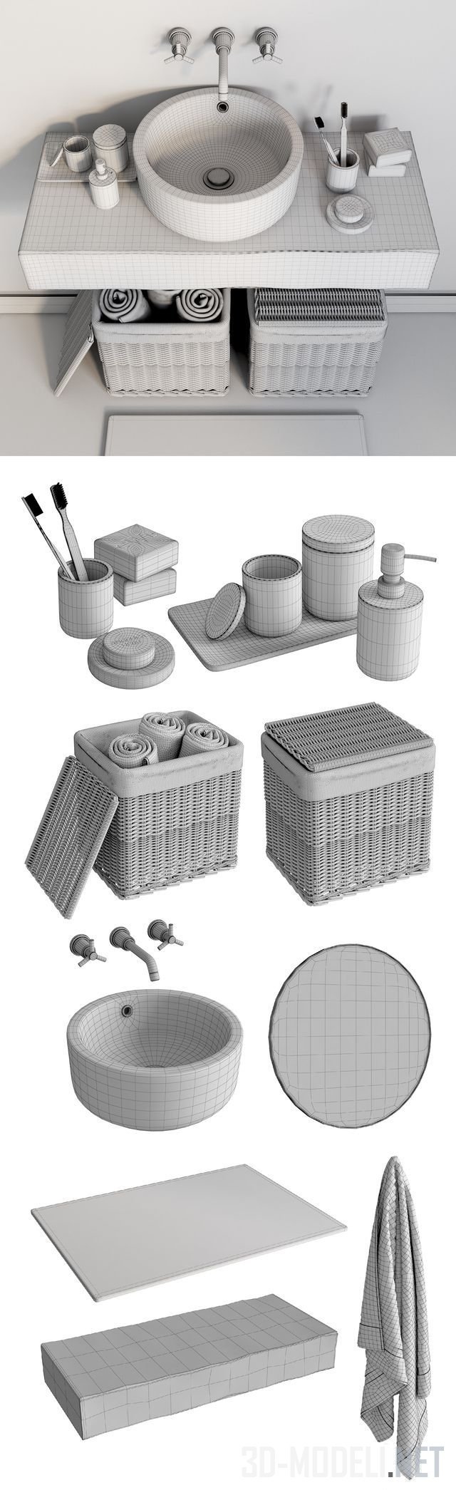 Набор аксессуаров и сантехники для интерьера ванной комнаты. В комплекте белая круглая раковина со смесителем на толстой прямоугольной деревянной столешнице, круглое зеркало, различный декор, баночки, мыльница, мыло, стаканчик с зубными щетками и две плетеные корзины с полотенцами.