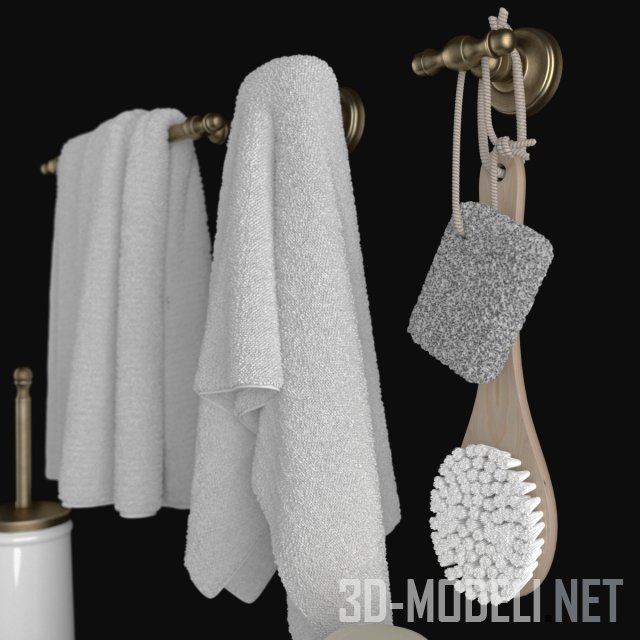 Несколько аксессуаров Migliore Mirella для интерьера ванной комнаты. В держателях цвета античной латуни вставлены белые стаканчики для зубных щеток, диспенсер, мыльница с куском мыла. Висят два белых банных полотенца и массажная щетка.