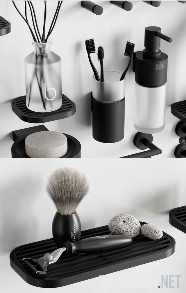 Стильный и современные аксессуары для ванной комнаты, бренд Dornbracht. В набор входят ароматизаторы для дома, кисточка для бритья, полотенце, мыло, держатель для полотенец, гель, духи, палочки, туалетная бумага, салфетки.