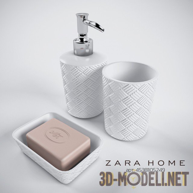 3D модель декоративного набора аксессуаров для санузла, выполненных из белой керамики, коллекция «Zara Home», артикул 45381105. В набор входит флакон для жидкого мыла, стаканчик и мыльница. Все текстуры на месте.