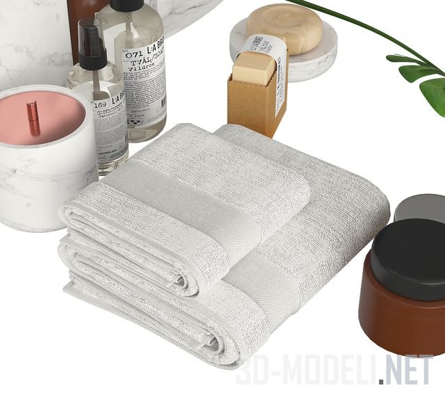 Набор аксессуаров и декора для ванной комнаты, преимущественно в светлых тонах. Сет содержит косметические средства La Bruket, мыло, полотенца, зубные щетки в стаканчике, салфетки и пр. Аксессуары выполнены из светлого мрамора, зеленый лист монстеры хорошо взаимодействует с ними.