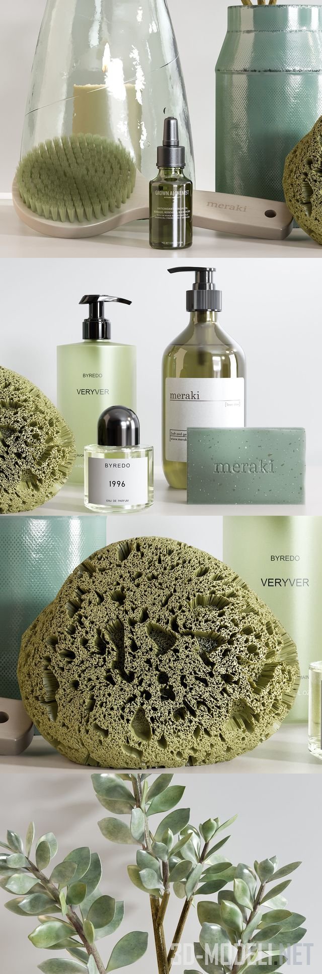 Набор аксессуаров для декора интерьера ванной комнаты: мочалка, массажная щетка, мыло, лосьон, крем, жидкое мыло, свеча в большой стеклянной банке и металлическая ваза светло-мятного цвета. В вазе стоит три ветки толстянки.