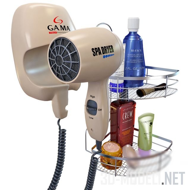 Качественная трехмерная модель GA MA Italy Spa Dryer – набор аксессуаров для ванной комнаты. В основе сета фен, который станет идеальным вариантом для ванной комнаты, отелей и спортивных клубов. Мощность фена 1600 Вт, он оснащен производительным и легким DC-мотором. Автоотключение при возвращении на базу, две скорости и два температурных режима, а также спиральный шнур входят в основных характеристики прибора. Полка с косметическими средствами присутствует.