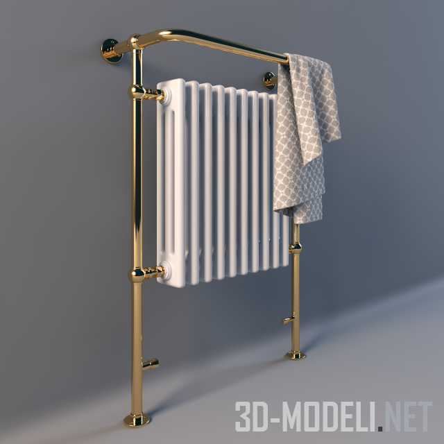 Современный полотенцесушитель в ретро-стиле LineaTre. Габарит изделия: 780 х 940 х 225 мм. Белый алюминиевый радиатор, имитирующий классические чугунные радиаторы, смонтирован на пристенную стойку из золотистой трубы. Верхняя часть трубы выполнена в виде горизонтального элемента, на который вешается полотенце. Доступны еще варианты в хроме и бронзе.