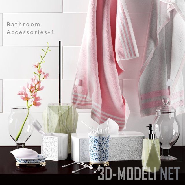 Набор аксессуаров для современной ванной комнаты с декором в виде завитков и парой розовых с белым махровых полотенец. Завитками декорированы поверхности белой пластиковой коробки для салфеток, квадратного стаканчика для зубных щеток. Цилиндрический стаканчик с ватными палочками и керамическая мыльница украшены синими завитками по белой поверхности. Стаканчик и мыльница установлены на золотистых подставочках. В данном наборе присутствуют также: стеклянная ваза с крышкой, диспенсер для жидкого мыла, ершик для унитаза, стеклянная ваза с цветущей веткой.