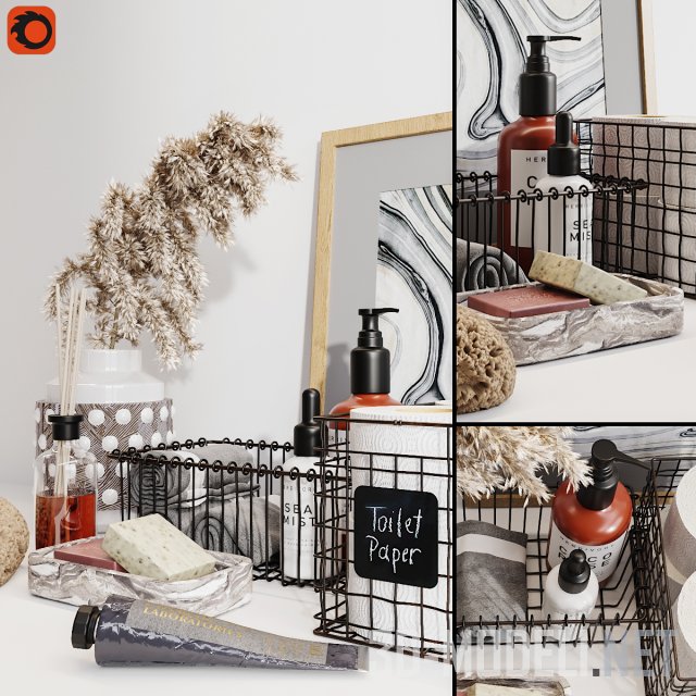 Различные предметы для наполнения интерьера ванной комнаты. В наборе множество средств и аксессуаров. Тюбик с кремом, металлические корзинки с туалетной бумагой, полотенцами, жидким мылом в диспенсере и морской водой, мраморная мыльница, пемза, керамическая ваза с пампасной травой и абстрактное черно-белое панно в деревянной рамке.