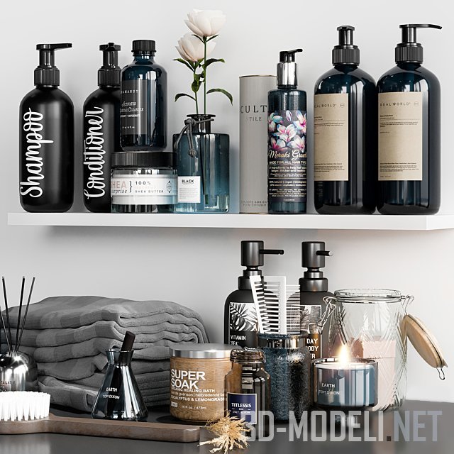 Современные косметические средства и аксессуары для ванной, разместившиеся на двух поверхностях. Центр композиции - черно-синяя ваза с белыми розами. Бутылочки с дозаторами в основном черного цвета, с белыми надписями. Кроме этого на полке и столешнице: массажная щетка с деревянной ручкой и белой щетиной, овальная черно-серая мыльница с розовым мылом, стопка серых махровых полотенец, сухая метелка тростника, свечи, баночки.