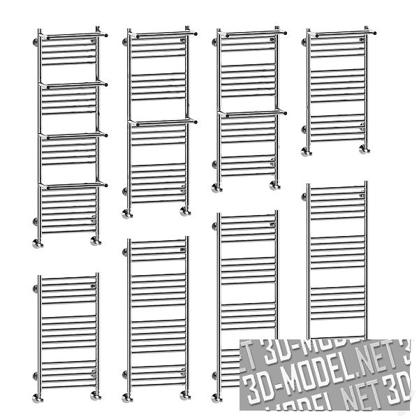 Несколько вариантов хромированных и черных водяных полотенцесушителей Terminus Aurora. Приборы выполнены в традиционном формате вертикальной «лесенки». В нескольких моделях предусмотрены дополнительные вынесенные перемычки (от одной до четырех). Представлены следующие высоты при общей ширине в 40см: 78см; 101см; 120см; 139см.