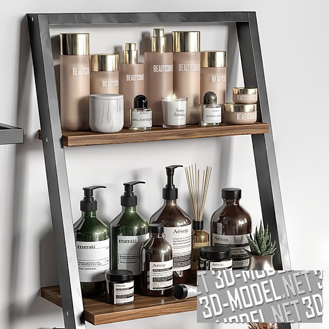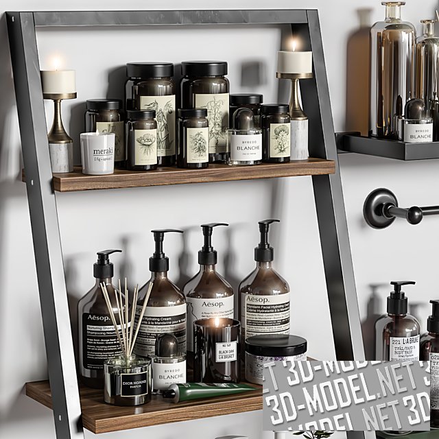 Большой набор средств по уходу за телом и аксессуарами для ванной комнаты на современной стойке. Витрина состоит из трех частей: две из них, по бокам, с наклонными металлическими стойками в виде серебристых вертикальных рам. В рамках - деревянные полки до стены. Средняя секция - несколько полок разного дизайна. На полках: рулоны с полотенцами, щетки, свечи, тюбики, флаконы с дозаторами и без, рулоны туалетной бумаги, баночки с маслами, аромопалочки, керамика, небольшие растения в горшочках.