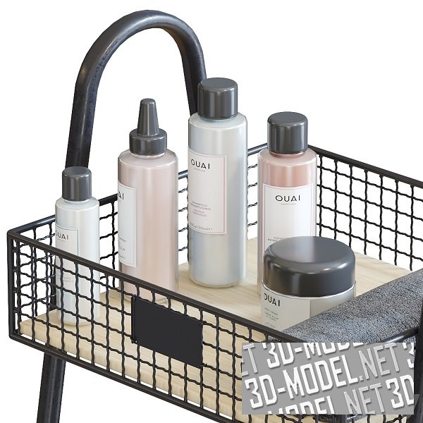 Эстетичный и функциональный декоративный набор для ванной комнаты, в основе которого тележка Lewis Storage Cart Urban Outfitters. Это двухъярусная тележка, с помощью которой можно удобно разместить необходимые вещи в небольшом помещении. Тележку отличает металлическая конструкция с дугообразными боковинами и решетчатыми краями каждого отделения, которая установлена на колесики. На полках размещены полотенца и косметика Ouai.