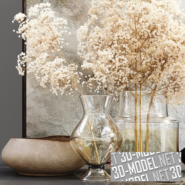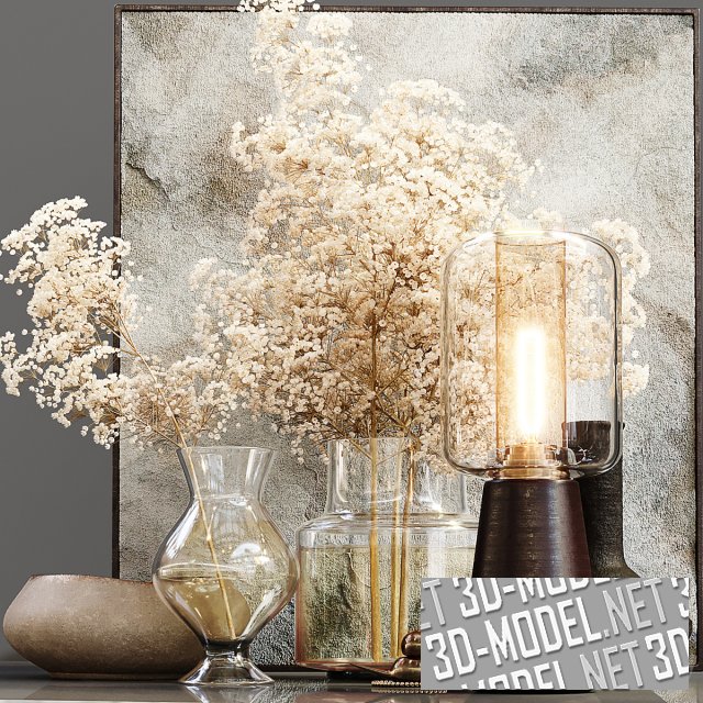 Набор интерьерного декора в композиции с несколькими пышными сухими ветками гипсофилы в стеклянных вазах. На заднем плане размещено прямоугольной панно в тонкой рамке. Панно изготовлено из живописного каменного пласта серовато-бежевых оттенков. Рустикальный вазон, черный кувшин, настольный светильник с ретро-лампой и бронзовая полированная фигурка птички - наполняют композицию интересными сочетаниями текстур и неброских тонов.