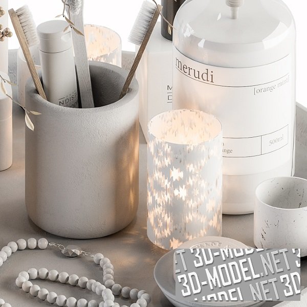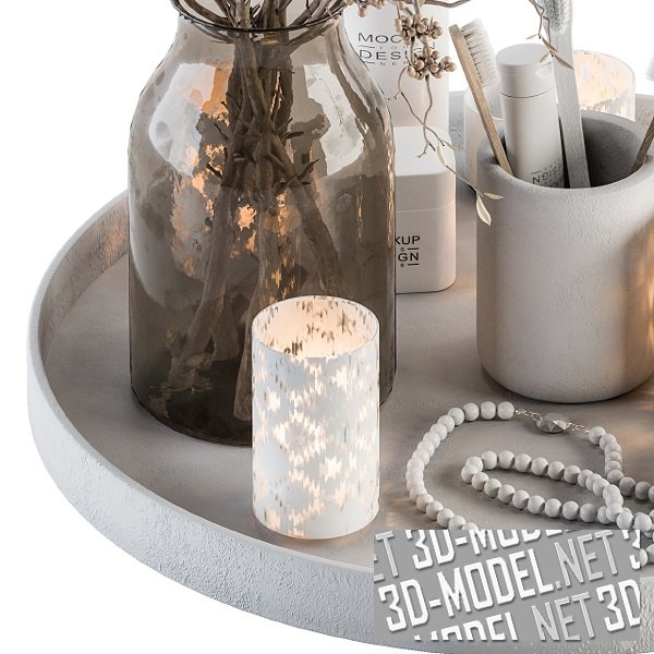 Круглый серый поднос с бортиками, декор и аксессуары в ванную комнату. На подносе: банка из серого дымчатого стекла с букетом из колючих веток с белесыми ягодами; подсвечники в виде резных белых стаканчиков; флакон с дозатором; мыло; крема; стакан с зубными щетками и зубной пастой; ожерелье из мелких белых бусин.
