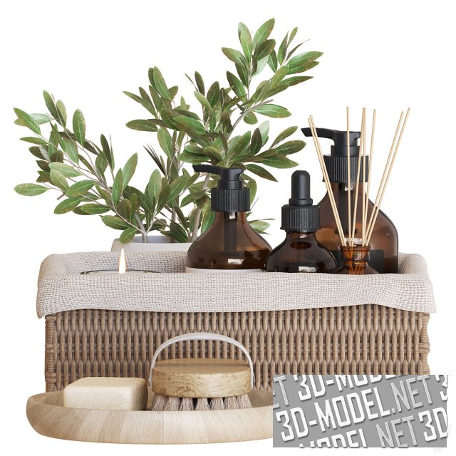 Декоративная композиция с ветками оливы в белой керамической вазе и банными аксессуарами. В прямоугольной плетеной корзине с белым тканевым чехлом размещены флаконы из коричневого стекла с дозаторами, аромо-диффузор с палочками, аромо-свеча в стеклянном сосуде, ватные палочки, баночка с кремом. Рядом с корзиной - сложенные махровые полотенца светло-песочного цвета и круглая деревянная тарелка с брусочком мыла и щеткой на овальной деревянной основе.