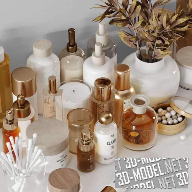 Коллекция ароматических и косметических масел, аксессуары для ванной и декор в белых и медовых тонах. В коллекции: белая керамическая ваза с сухими ветками, баночки и тюбики, флаконы с дозаторами, распылителями и золотистыми пробками, расчески и ватные палочки, аромо-диффузор, пудра и белая толстая свеча в стеклянном стакане.