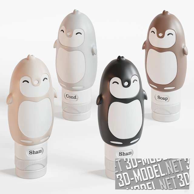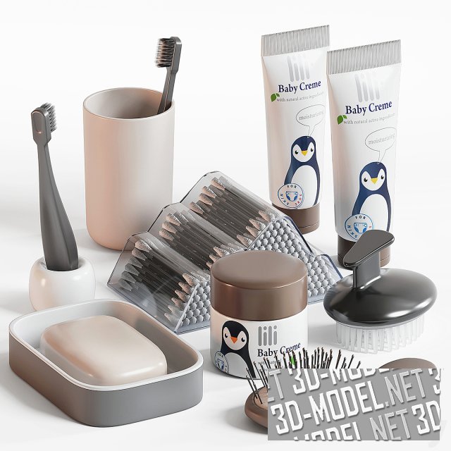 Набор современных аксессуаров для детской ванной комнаты в серо-коричневых тонах. Основа набора - комплект флаконов для жидкого мыла, шампуни, кондиционера, в виде забавных пингвинов серого, черного, бежевого и коричневого цветов. Стопка сложеных махровых полотенец серых и бежевых тонов, серая мыльница с мылом, зубная щетка на белой подставке, крема Lili с пингвинами на упаковке в тюбиках и баночке, щетка, расческа и стаканчик.