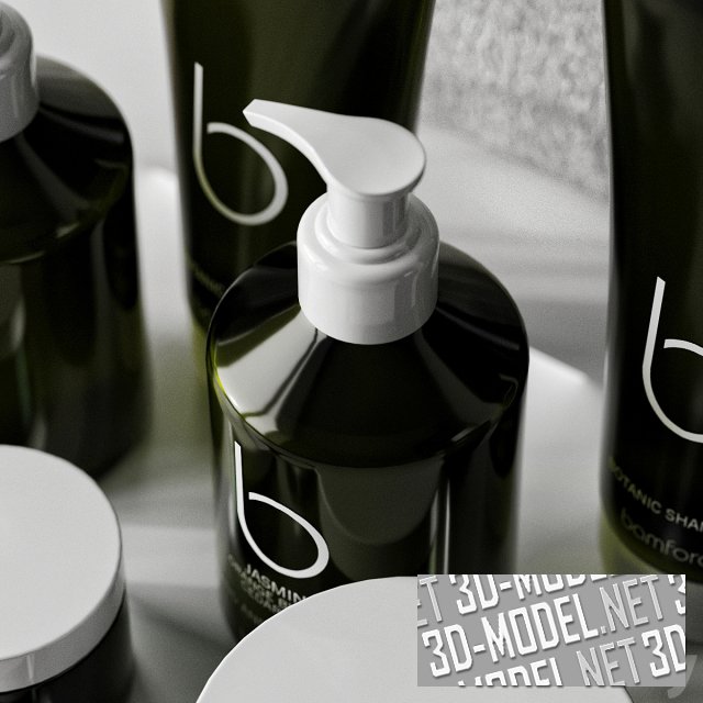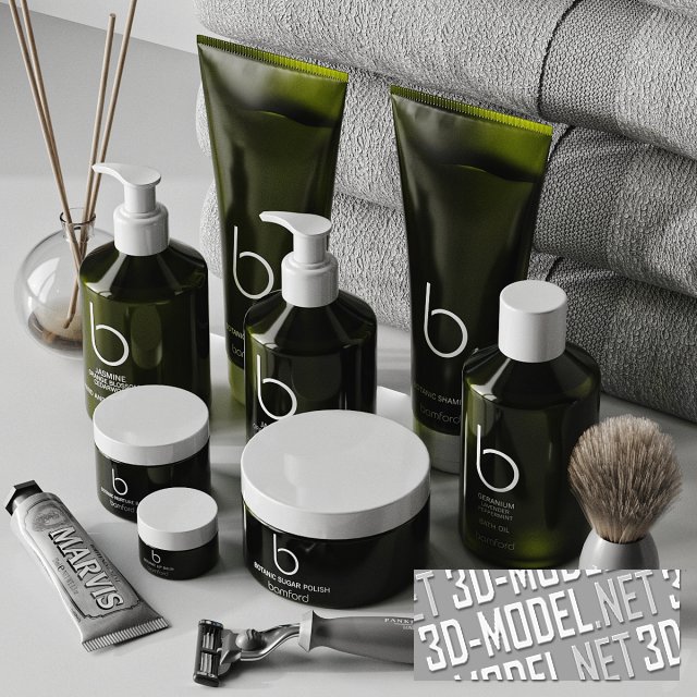 Набор ванных принадлежностей, который состоит из косметики и гигиенических средств от производителя Bamford. Также к комплекту прилагается бритва, помазок и стопка банных полотенец.
