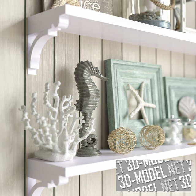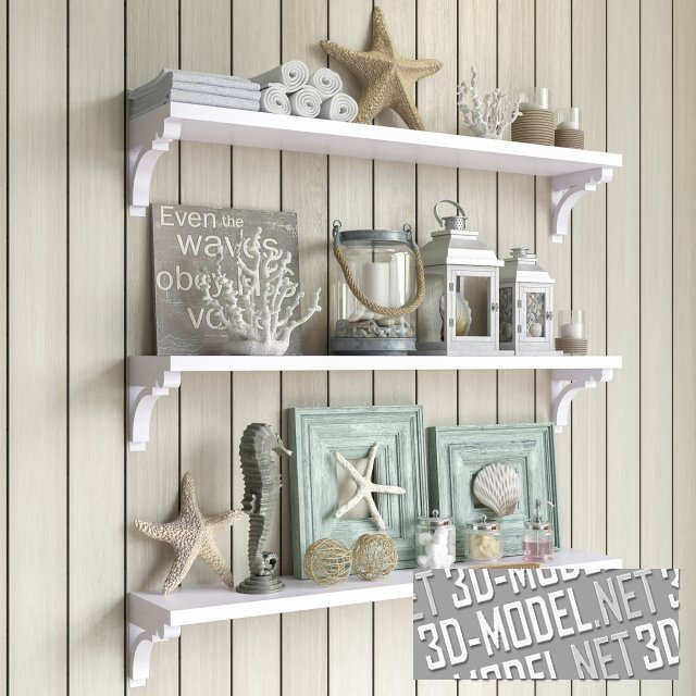 Три красивые белые полки размером 1000 x 200 x 170 мм с набором декоративных предметов в морском стиле, хороший варинат для интерьера ванной комнаты. В комплекте золотистая и белая морские звезды, белые кораллы, морской конек, свечи, белые полотенца, вазы, ракушки, картины в голубых рамках, расческа, светильники, ватные палочки и шарики.