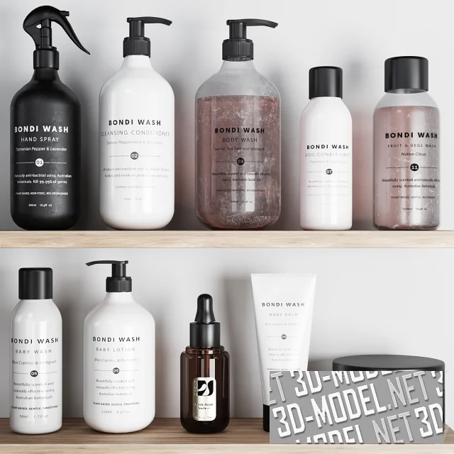 Современное наполнение полок ванной комнаты с аксессуарами и средствами по уходу за телом от Bondi Wash. В наборе: пузыри, баночки и тюбики от Bondi Wash, аромо-диффузор и аромо-свеча от balmuir, коробок со спичками, настольный светильник 101CPH Sitting Man со скульптурным основанием из бело-серого камня и белым шариком плафона, несколько рулонов полосатых полотенец серо-белого цвета, стакан с зубными щетками.