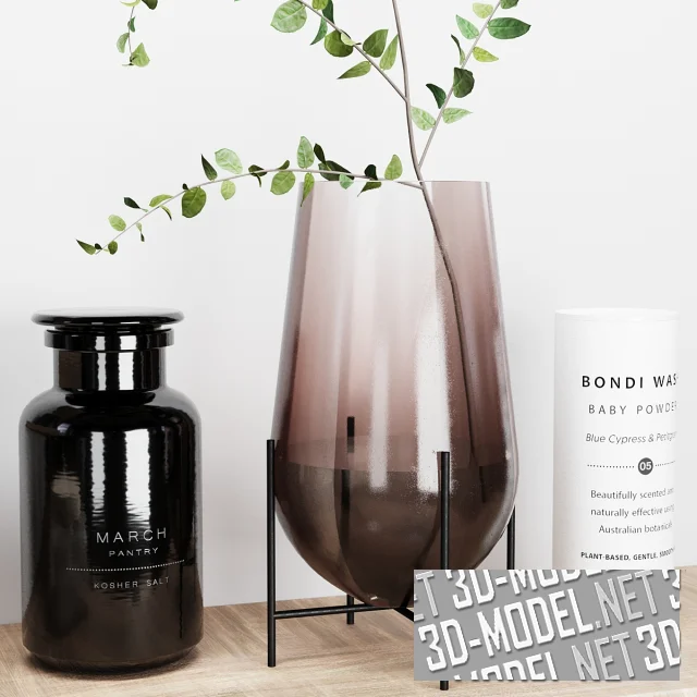В качестве декора в сцене размещена декоративная ваза с зеленой веточкой. Стеклянная часть вазы, установленная на металлическую подставку тонирована коричневым, с плавным переходом от почти прозрачного сверху до черно-коричневого внизу.