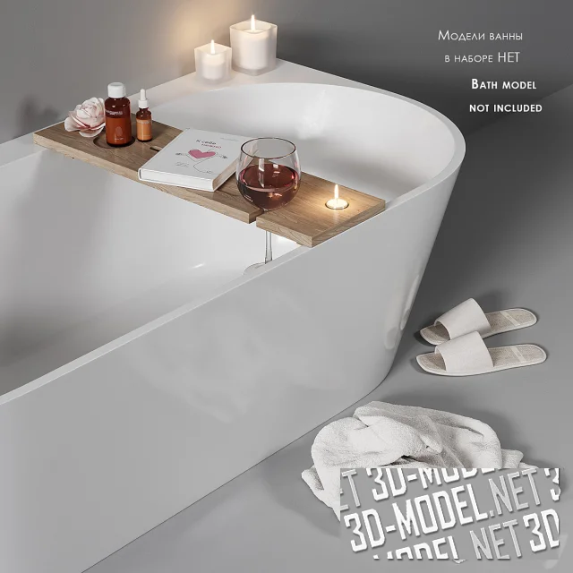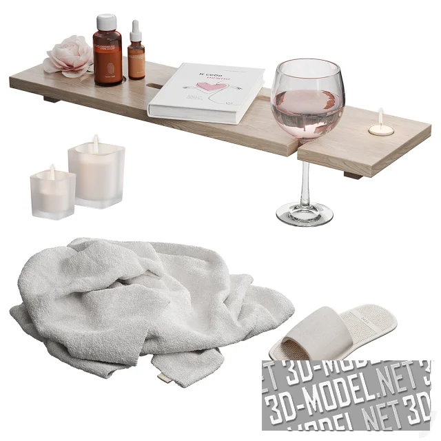 Столик изготовлен из дубовой доски и покрыт маслом для защиты от влаги. Размер: 70х20з5 см. Сцену дополняет множество аксессуаров и элементов декора. Это брошенное на пол полотенце, бокал, розовое вино, свечи, роза, книга «Tender to yourself», косметика, тапочки Zara Home.