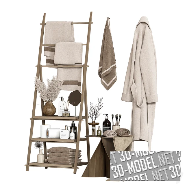 Современная деревянная этажерка и приставной столик из термогнутой фанеры с аксессуарами для ванной комнаты. На полках и перекладинах этажерки, вешалках и на столе размещены белый халат, махровые бело-бежевые полотенца, керамические и комбинированная (дерево и стекло) вазы с сухими растениями, настольное криволинейное зеркало на металлической подставке, рулоны бумажных салфеток, средства по уходу за телом, кисточки в стакане, аромо-диффузор.