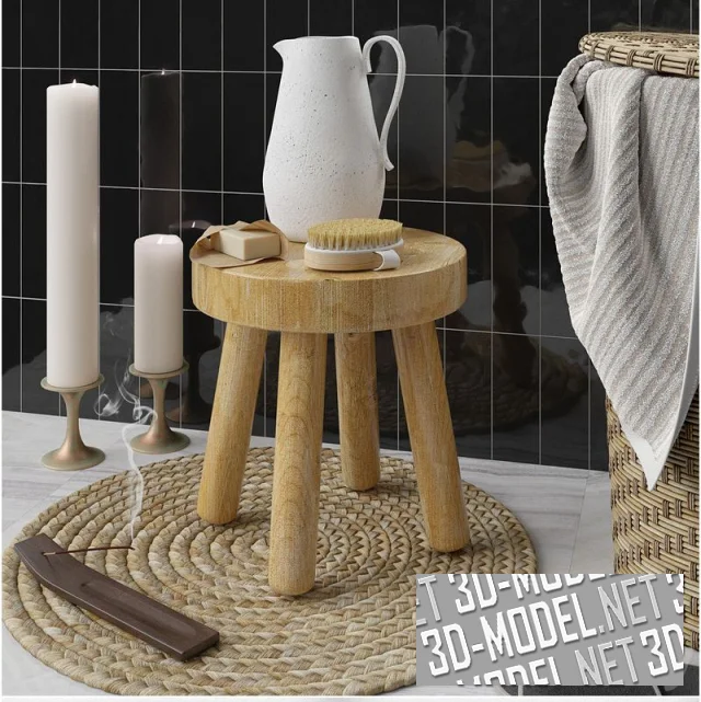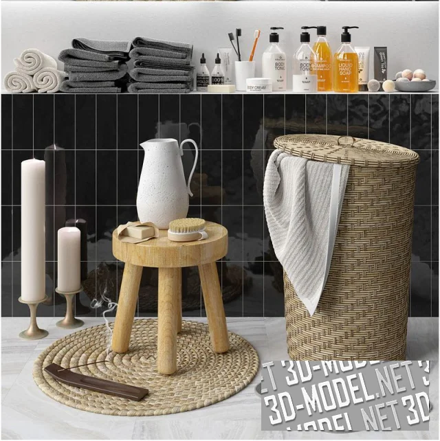 Современные аксессуары для ванной комнаты. Комплект с плетеным круглым ковриком из пальмового листа, цилиндрической корзиной для белья, плетеной из ротанга и деревянным круглым табуретом. Кроме этого в наборе две большие толстые белые свечи на латунных подсвечниках, аромопалочка на деревянной подставке, серые банные тапки, белый кувшин, щетка для тела, мыло, махровые полотенца белого и графитово-серого цветов, флаконы, тюбики и баночки со средствами по уходу за телом, зубные щетки в стакане, серая каменная миска с шариками для ванны.