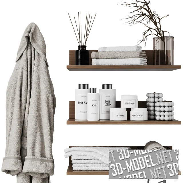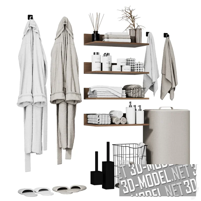 Набор для ванной комнаты с современными аксессуарами и декором. В комплекте пара махровых халатов (белого и цвета слоновой кости); банные тапки двух оттенков; деревянные полки; черные металлические корзины разного размера; махровые полотенца двух оттенков; корзина для белья; черные ершики для унитаза (настенный и напольный); дозаторы для жидкого мыла; средства по уходу за телом в белых баночках и флаконах; аромо-палочки в черном флаконе аромо-диффузора; ваза дымчатого стекла с сухими ветками; настенные крючки-вешалки черного цвета.