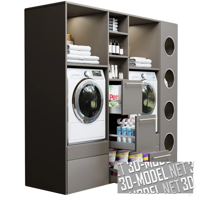 Современный мебельный блок для прачечной, с белой стиральной машиной и сушилкой, запасами бытовой химии, белыми полотенцами, косметическими средствами и парфюмом. Блок оснащен нишами, открытыми полками, выдвижными ящиками и створкой с четырьмя круглыми «иллюминаторами».