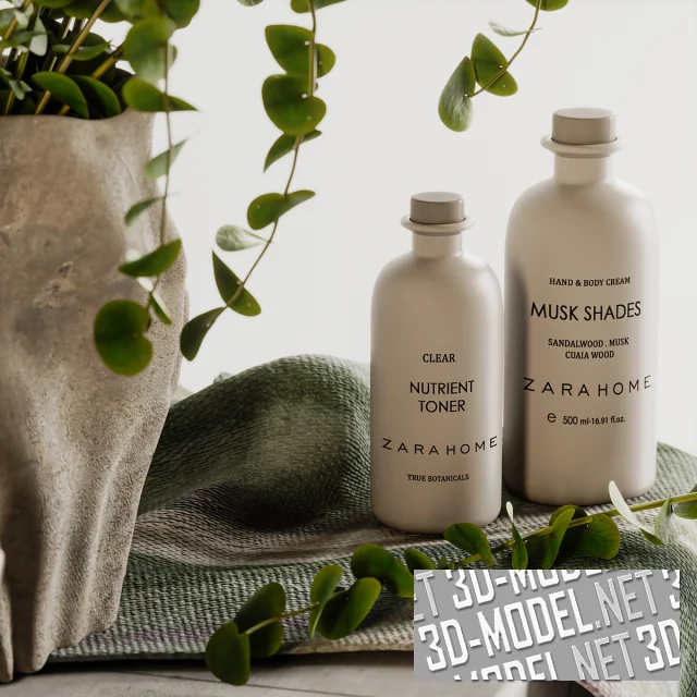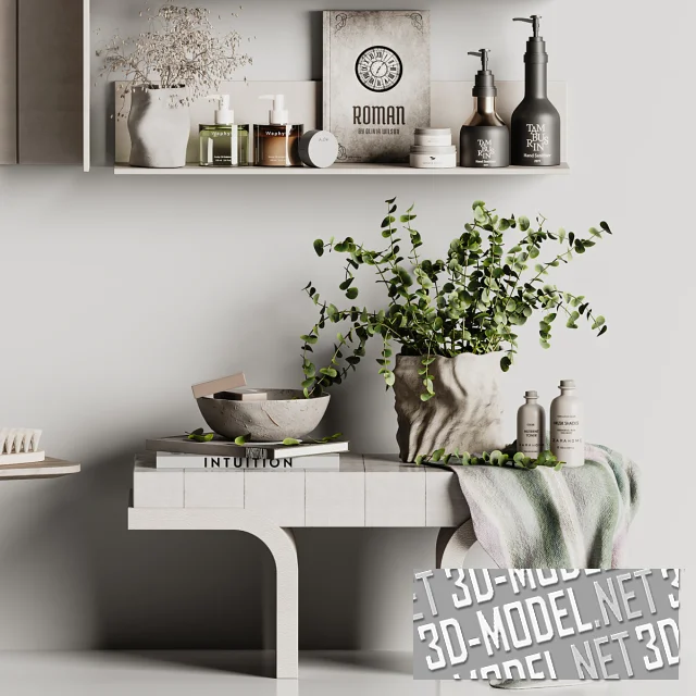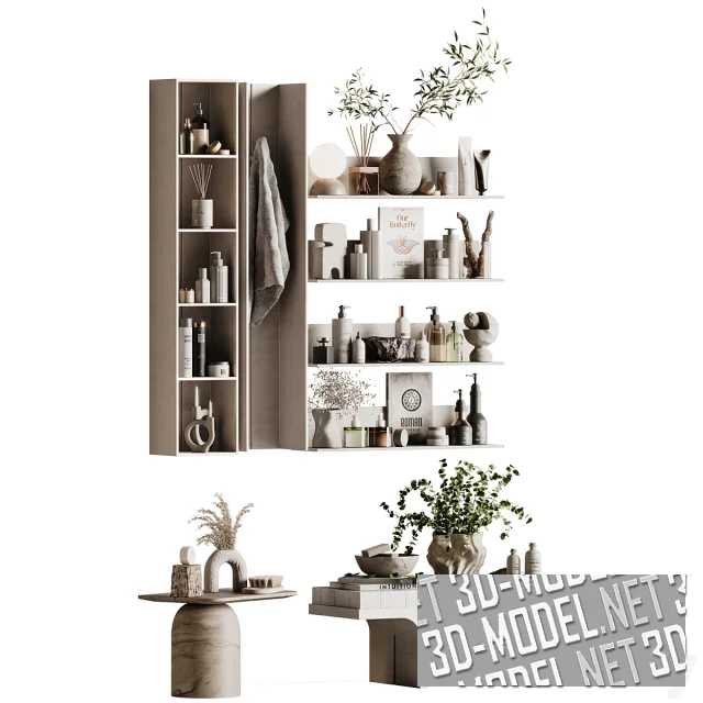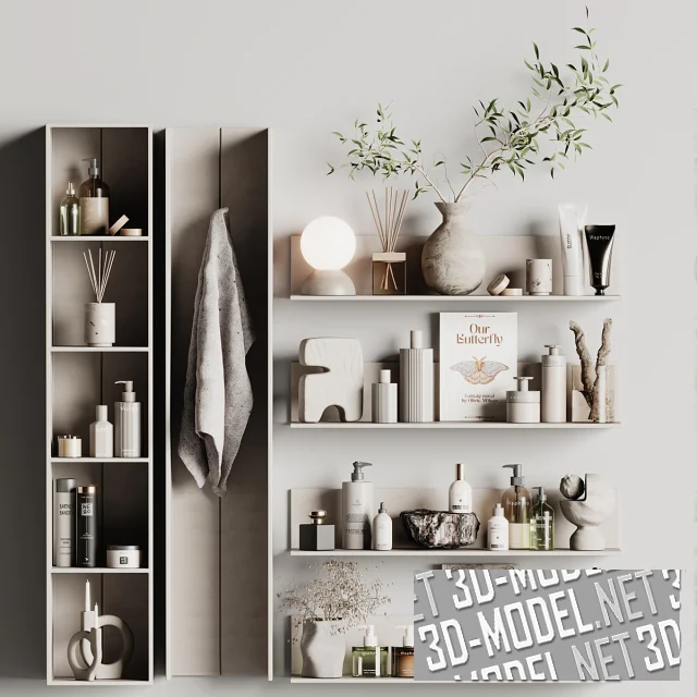 Современная коллекция аксессуаров для ванной и средства по уходу за телом. В наборе: навесные двухплоскостные белые полки, светлые навесные вертикальные узкие пеналы (с полками и с полотенцем на вешалке), каменный приставной столик с круглой гладкой массивной опорой и прямоугольной столешницей, прямоугольный кофейный столик с толстой столешницей на двух широких изогнутых опорах. На поверхностях художественная керамика, вазы с зелеными и сухими ветками, щетки, блюда, полотенца, аромо-диффузоры, книги, настольный светильник с шариком плафона, подсвечники, косметические средства и средства по уходу за телом. Все элементы подобраны с доминантой светло-бежевых оттенков.