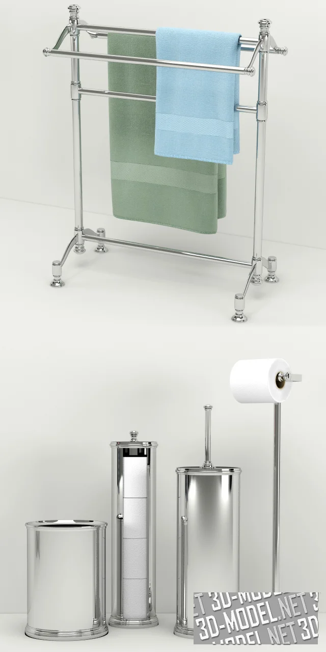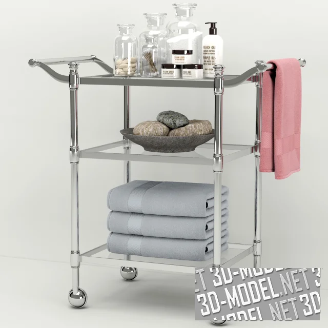 Современное оборудование и аксессуары от RESTORATION HARDWARE. В сете никелированная стойка с махровыми полотенцами зеленого и голубого цвета, напольный держатель с белой туалетной бумагой, металлическая тележка на колесиках. На полках тележки флаконы, полотенца и другие аксессуары.