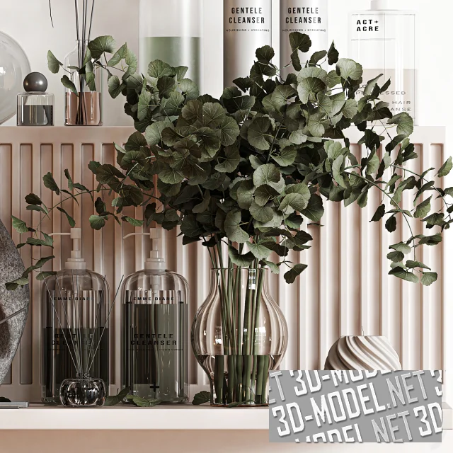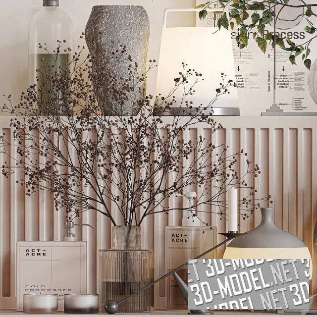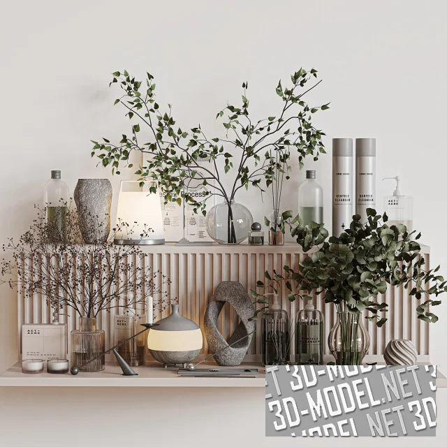 Современный набор аксессуаров и декора для ванной комнаты. В сете несколько ваз (керамические, стеклянные и каменные) с букетами из зеленых веток и сухой гипсофилы; средства по уходу за телом; аромодиффузоры и аромо-свечи; пара настольных светильников в современном стиле (в виде белой матовой вазы на серебристой круглой площадке и в виде серого кувшина). Композиция выстроена на светлом подиуме с двумя плоскостями. Фронтальная плоскость подиума декорирована вертикальными прямоугольными нишами.