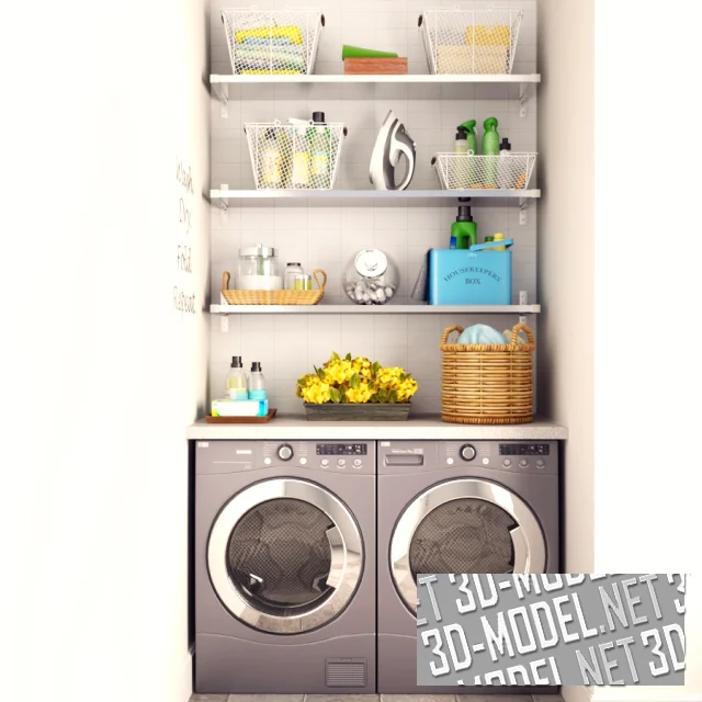 Грамотно организованное место для стиральной (сушильной) машины в пространстве ванной комнаты или прачечной поможет сэкономить место, время и силы. Нишевая система расположения смотрится функционально - приборы не занимают много места, а на полках размещено множество необходимых средств и аксессуаров, а также декор.