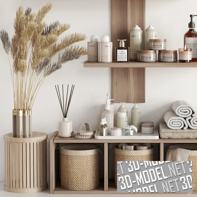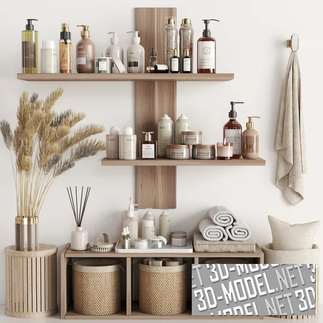 Две полки из светлого дерева, уставленные различными аксессуарами для интерьера ванной комнаты: плетеные коробки, шампуни, крема, гели, полотенца, аромадиффузор и пр. Вешалка с полотенцем и букет пампасной травы дополняют инсталляцию.