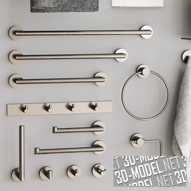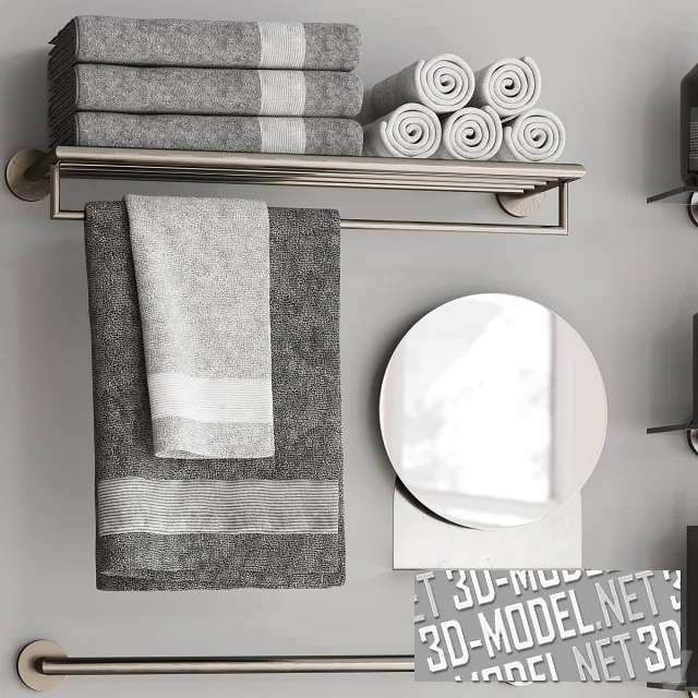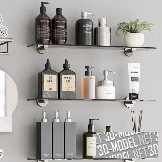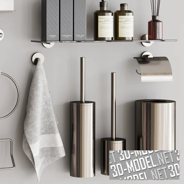 Современный набор серебристых аксессуаров для ванной комнаты. В сете настенные полки, вешалки и крючки для полотенец и одежды, держатель полотенец, туалетной бумаги, навесные держатели ершика, круглое настенное зеркало. На полках и вешалках серые махровые полотенца, флаконы со средствами по уходу за телом, аромо-диффузор с черными палочками в стеклянном темно-коричневом флаконе. В качестве декора на полке стоит белый горшок с зеленым растением.
