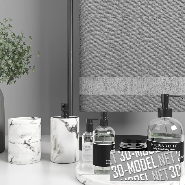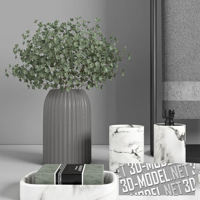 Аккуратно собранный набор аксессуаров для ванной комнаты, выполнен в спокойной серо-мраморной гамме, что создает ощущение чистоты, порядка и современного уюта. На мраморных подносах расположены дозаторы, флаконы и баночки с косметикой, выполненные в минималистичном стиле с черными акцентами. Рядом стоит стакан и держатель для мыла из белого мрамора с характерными прожилками, а массивное полотенце с мягкой текстурой висит на лаконичной металлической стойке. Композицию завершает высокая керамическая ваза с ребристой поверхностью и густым пучком зеленых веточек, добавляющих живой и освежающий акцент в интерьер.
