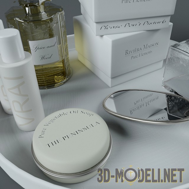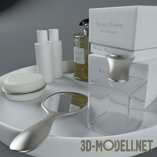 3D модель набора косметики для ванной комнаты. Модель 3dsMax 2014 + obj (Vray). В набор входит парфюмерия, зеркальце и различные крема. Эстетически белоснежный, с золотыми и серебрянными элементами, такой набор украсит интерьер ванной комнаты, внеся в него натуральность и уют.