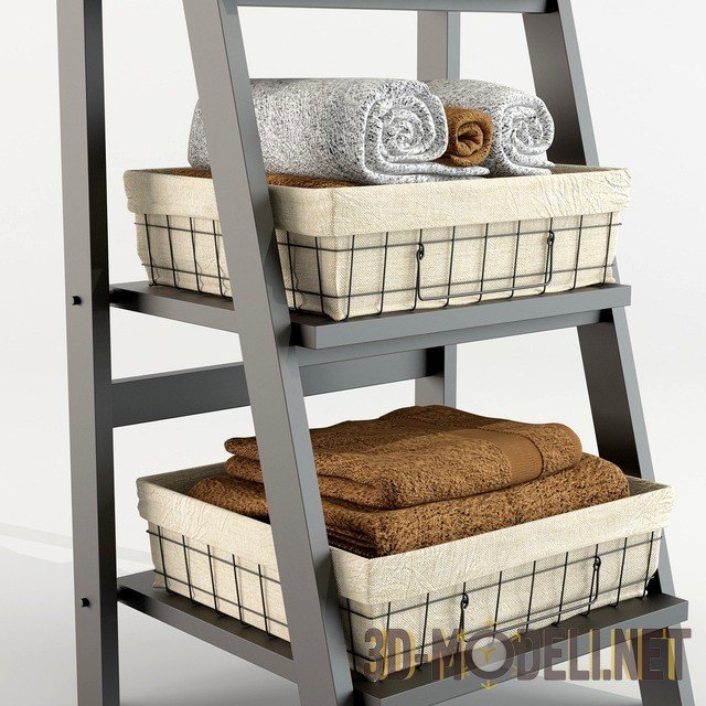 3d-модель полки для санузла, сделанной в виде лестницы-стремянки, светло-серого цвета, с текстурой дерева. На четырех полках стоят очаровательные клетчатые низкие и широкие корзиночки с банными принадлежностями: бежевыми и коричневыми махровыми полотенцами, мочалками, морской солью и пр.