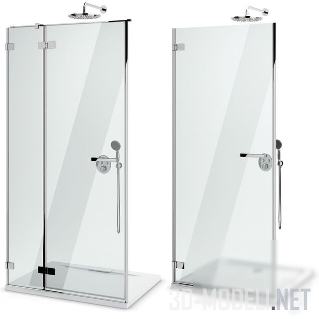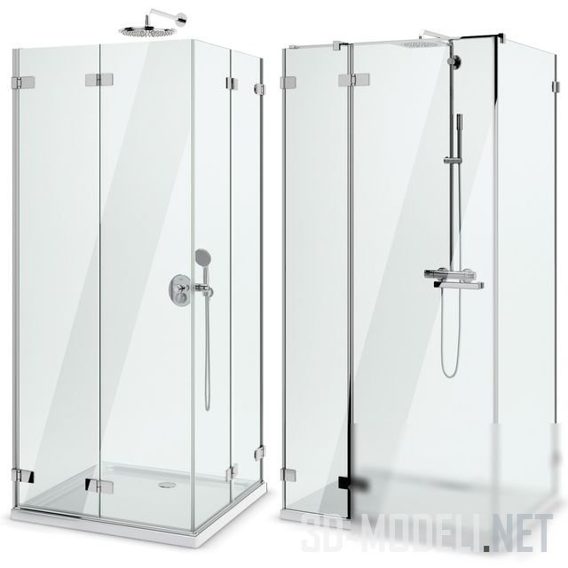 Несколько вариантов стеклянных душевых кабин и душевых дверей от Radaway Arta 101. На базе квадратных (1х1м) и прямоугольных (1х1,2м) душевых поддонов представлены комплекты кабин, оснащенные хромированными смесителями и стойками с крупными круглыми рассеивателями.