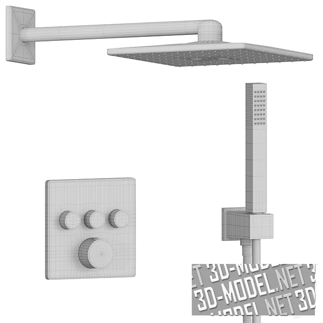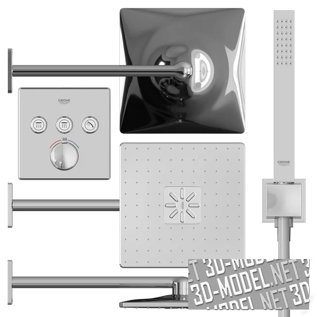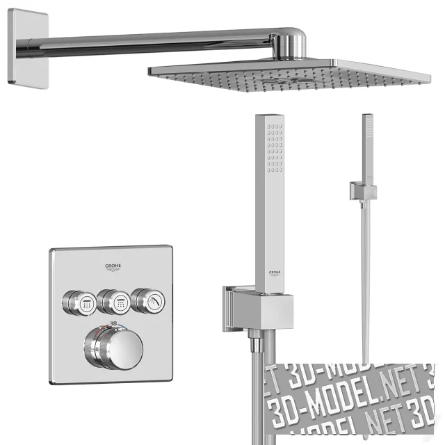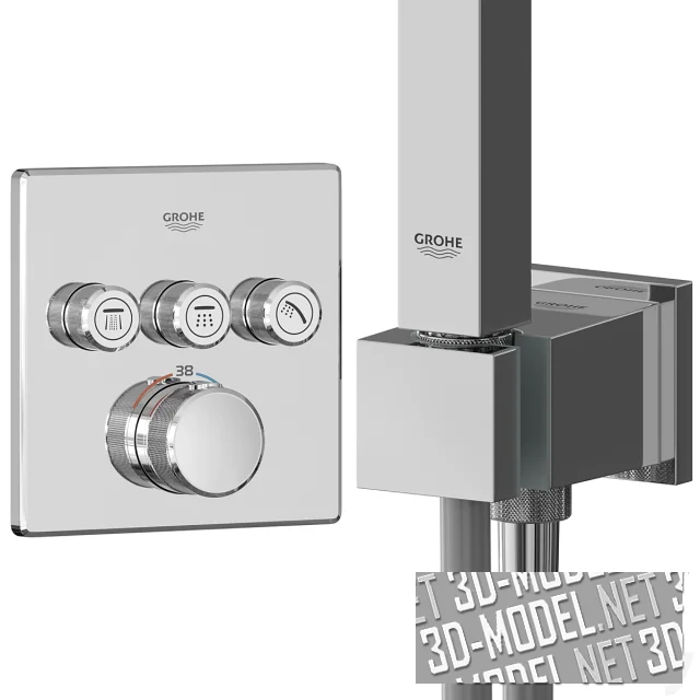 Современная душевая система Grohe GRT SmartControl имеет встраиваемый термостат с 3 кнопками управления: GROHE Grohtherm SmartControl верхний монтажный комплект 29126000. Верхний душ: Grohe Rainshower 310 SmartActive Cube с 2 режимами струи 26479000. Ручной душ: Grohe Euphoria Cube Stick 27698000. Шланговое соединение с держателем: Grohe Euphoria Cube 26370000. Шланг для душа: Silverflex 1.500 мм 28364000).