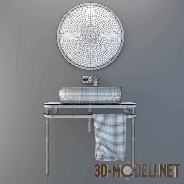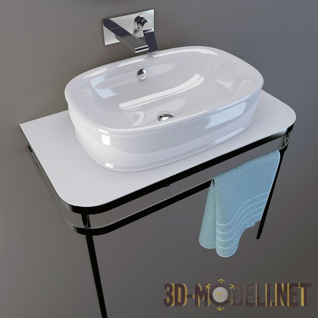 Набор в ванную комнату от бренда ArtCeram из коллекции Azuley. Размер раковины со скруглёнными углами и высокими бортами – 65 x 45 см. Она размещена на лёгком столике с металлическими ножками и каркасом, а также белой гладкой поверхностью столешницы. На перекладине столика висит голубое махровое полотенце. Современный смеситель смонтирован на стене. Над мойкой висит круглое зеркало с широкой фацетой.