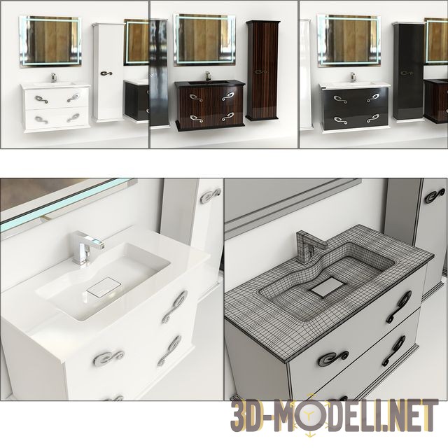 Набор La Beaute Loiret для меблировки ванной комнаты. В набор входят: подвесная тумба со встроенной раковиной и современным смесителем, подвесной вертикальный шкаф и прямоугольное зеркало с подсветкой. Фасады выдвижных ящиков и створки шкафа украшены металлическими ручками в стиле ар–нуво. Мебельные комплекты представлены в трёх вариантах: белом, глянцевом чёрном и глянцевом макассар.