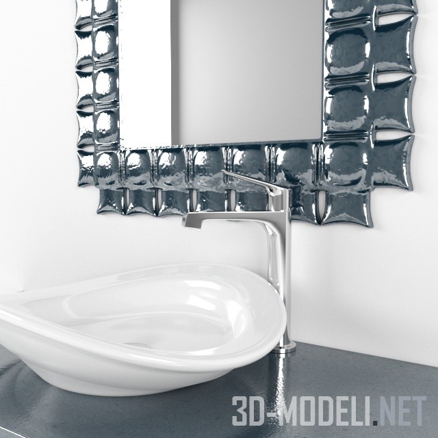 Комплект в ванную комнату с «легким характером». Прямоугольное зеркало, обрамленное в декоративную раму из глянцевых выпуклых квадратов. Под зеркалом: накладная раковина на серой столешнице. Белая раковина укомплектована высоким современным смесителем. Подставкой для столешницы служит пара фигурок, изображающих серых дельфинов.